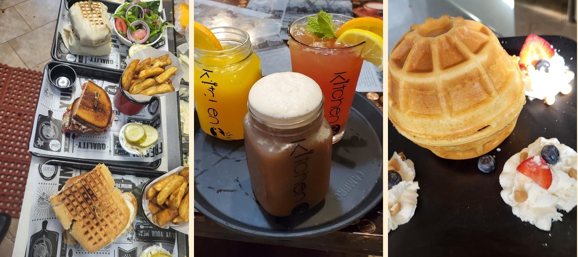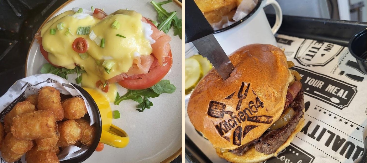 Kitchen 64 offers breakfast, brunch, and lunch. The menu includes delicious options like omelettes, pancakes, burgers, sandwiches, and healthy side dishes. Each dish is prepared with freshness in mind.